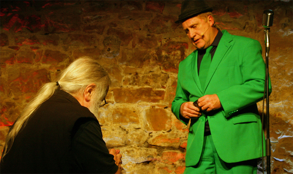 Es gibt soviel Dinge, über die sich der Mann aus Bempflingen aufregen kann, so viele, dass man dabei leicht den Überblick verliert. Brötchenpreise, Verschwendungs-sucht, Amts- und Gsälzschimmel sowie Nachbarschaftsstreit. Dabei lässt er sich die Themen auch gerne von seinem Publikum diktieren. Selten war sich Ärgern so lustig, wie bei „Hämmerle eskaliert!! Vor allem wenn er es für sie tut. Und was meint er zu den Aktivitäten der Letzten Generation? „Wegen dem Kunstwerk isch es mir egal: Aber So goht mer nicht mit dem Essen um„ Bernd Kohlhepp ist ein Multi-Talent. Er spielt, singt und tanzt. Er schwadroniert mit dem Publikum, moderiert, marodiert und balanciert dabei mit dem Publikum und greift sich im Stehen seine vielfältigen Themen aus der Luft.